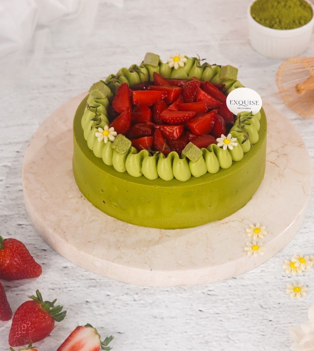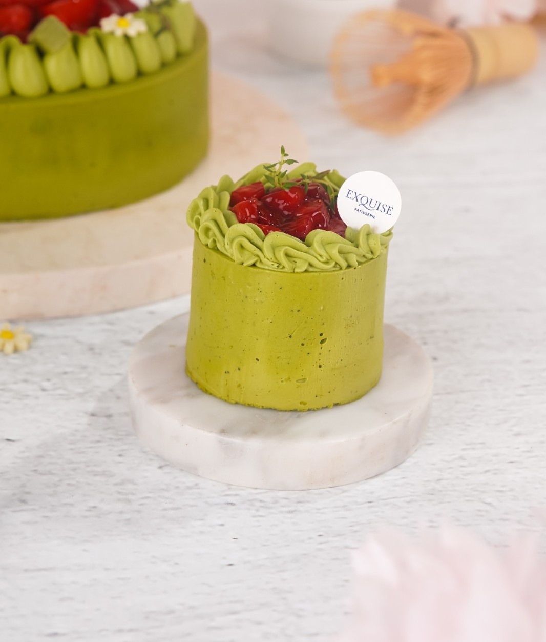 Matcha Sponge,Match Mouse, Raspberry Confit, Vanilla Cream, Chantily Matcha, Matcha Chocolate & Strawberry Fresh
